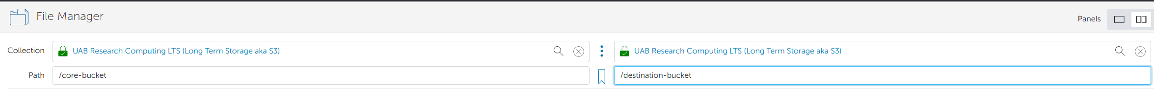 Globus is another option for transferring data using a GUI as opposed to a command line. When using Globus, you will need to set up the LTS endpoint using the credentials for the shared allocation. Access the LTS endpoint in both window panes and type the names of the buckets to transfer to and from. See the image below as an example