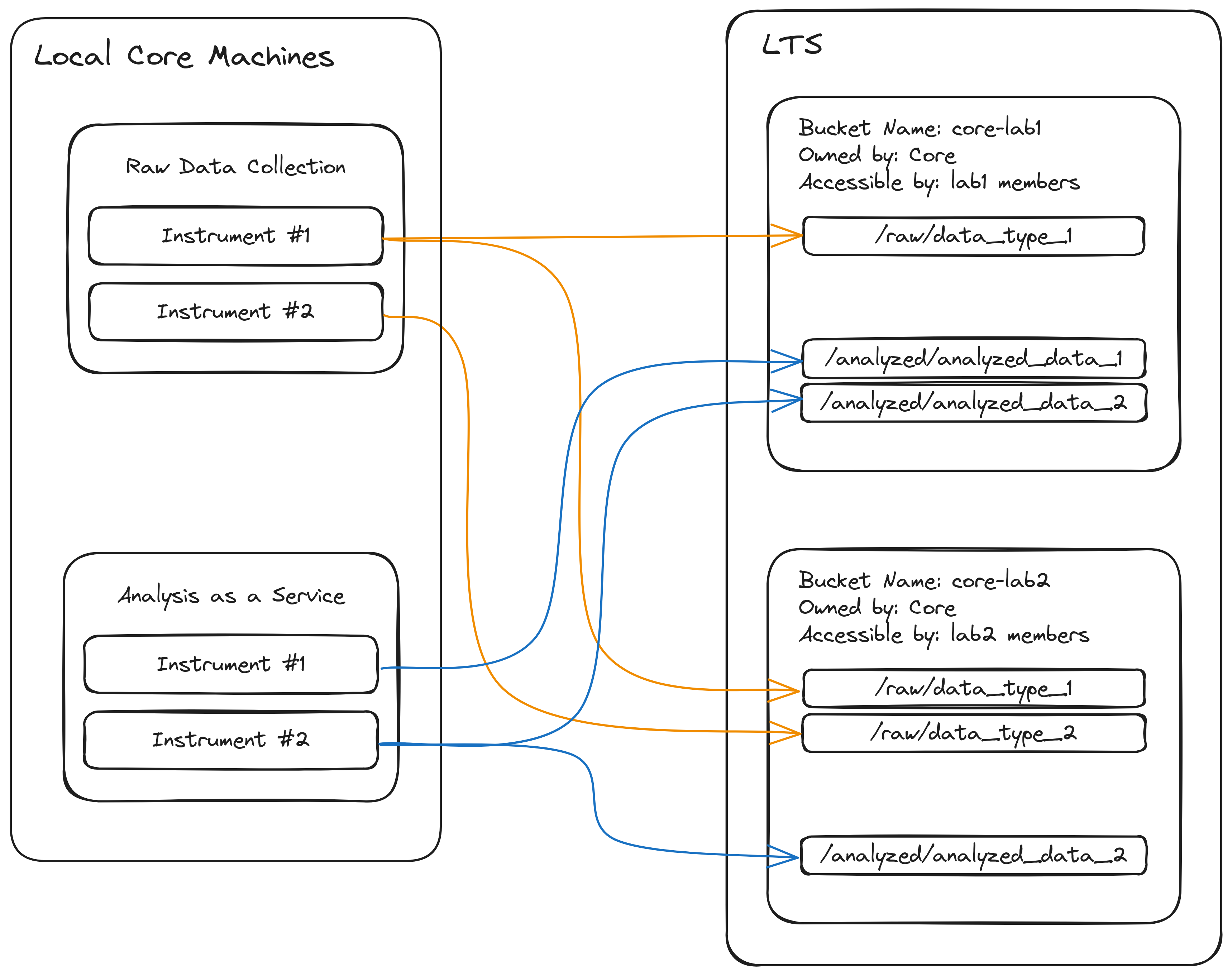 - The Core creates a bucket for each lab or group it services containing raw or analyzed data for that group. Permissions for each bucket are managed independently.