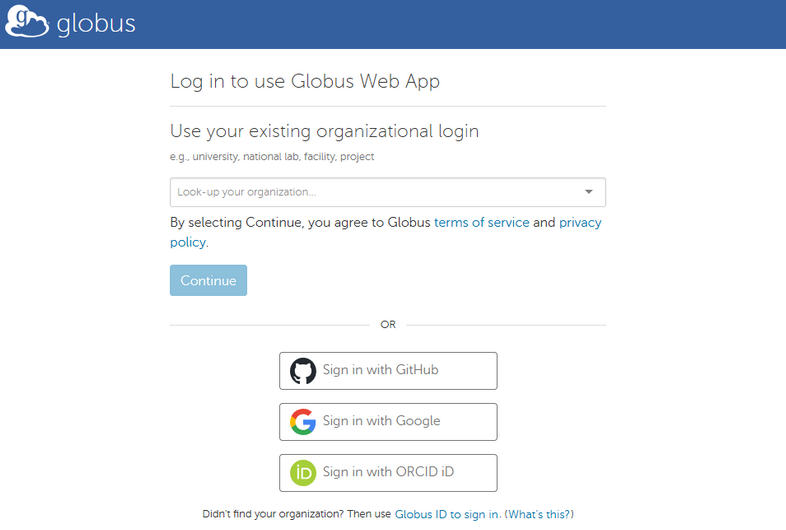 Use your browser to navigate to https://app.globus.org. You should see a login page similar to the one shown below. Click "LOG IN".